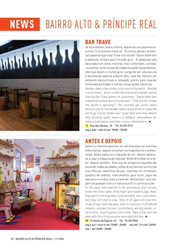 Antes e Depois Antes os meninos queriam ser astronautas e as meninas enfermeiras, depois tornaram-se engenheiros e professoras. Antes sabia-se a tabuada de cor, depois passouse a usar a máquina de calcular. Antes brincava-se a valer, depois também. Esta loja de antigos brinquedos vai encantar todas as idades, estão lá os maiores sonhos da sua infância; cavalinhos de pau, cozinhas em miniatura, quadros de ardósia, instrumentos para tocar, jogos de tabuleiro e muitas mais surpresas. Venha fazer uma viagem ao passado com a criança que foi e continua a ser. In the past, kids wanted to be astronauts and nurses, knew the times table off by heart and loved to play. Now, they want to be engineers and teachers, use a calculator, but they still love to play. Kids of all ages will love this shop of toys from the past, with its memory of childhood dreams: wooden horses, toy kitchens, writing slates, instruments, board games and more. Take a trip into the past with the child you once were and still are. M 8H