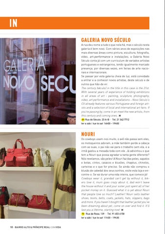 IN Galeria Novo Século A rua deu nome a tudo o que nela há, mas o século nesta galeria é bem novo. Com vários anos de exposições nas mais diversas áreas como pintura, escultura, fotografia, vídeo, art-performance e instalações, a Galeria Novo Século conta já com um curriculum de variados artistas portugueses e estrangeiros, tendo igualmente marcado presença, por diversas vezes, em feiras de arte nacionais e internacionais. Se passar por esta galeria cheia de luz, está convidado a entrar e a conhecer novos artistas, deste século e de outros que hão-de vir. The century (século) in the title in this case is the 21st. With several years of experience of holding exhibitions in all areas of art - painting, sculpture, photography, video, art performance and installations - Novo Século’s CV already features various Portuguese and foreign artists and a selection of local and international art fairs. If you’re passing by, come in an meet the new artists, from this century and coming ones. M 6H