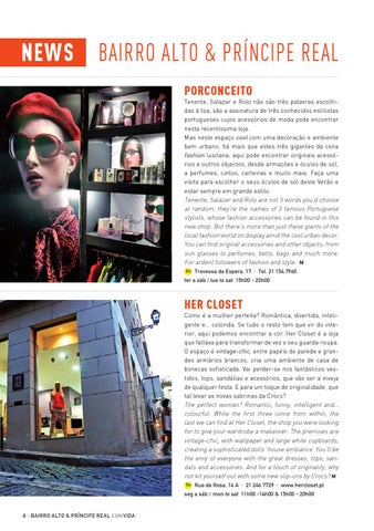 Her Closet Como é a mulher perfeita? Romântica, divertida, inteligente e… colorida. Se tudo o resto tem que vir do interior, aqui podemos encontrar a cor. Her Closet é a loja que faltava para transformar de vez o seu guarda-roupa. O espaço é vintage-chic, entre papéis de parede e grandes armários brancos, cria uma ambiente de casa de bonecas sofisticada. Vai perder-se nos fantásticos vestidos, tops, sandálias e acessórios, que vão ser a inveja de qualquer festa. E para um toque de originalidade, que tal levar as novas sabrinas da Crocs? The perfect woman? Romantic, funny, intelligent and… colourful. While the first three come from within, the last we can find at Her Closet, the shop you were looking for to give your wardrobe a makeover. The premises are vintage-chic, with wallpaper and large white cupboards, creating a sophisticated dolls’ house ambiance. You’ll be the envy of everyone with the great dresses, tops, sandals and accessories. And for a touch of originality, why not kit yourself out with some new slip-ons by Crocs? M 7H