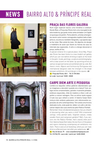 news Bairro alto & príncipe real Praça das Flores Galeria Num lugar especial nasceu uma iniciativa a condizer. Desde Maio, a Praça das Flores tem uma nova galeria de arte moderna, que pode visitar antes de beber um Capilé no quiosque do jardim. Porta adentro, artistas emergentes assim como nomes consagrados expõem lado a lado pintura, escultura e também fotografia, cuja aposta aqui se faz notar. Mas ainda há mais. Há objectos de design e mobiliário de autor que fazem as honras da casa no intervalo das exposições. A arte e o design desceram à praça, venha vê-los. A special initiative for a special place. Since May, Praça das Flores has been home to a new modern art gallery which you can visit before drinking a capilé at the kiosk in the park. Inside, paintings, sculpture and photography, with a clear accent on the latter, by upcoming artists as well as recognised names are exhibited side-by-side. But there’s more. Objects and furniture by Portuguese and international designers take the limelight in the break between exhibitions. Art and design in the square. LB 3E