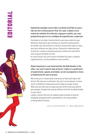 Roast chestnuts in one hand and the ConVida Guides in the other, you won’t want to stay at home. Lisbon is a patchwork of experiences, spaces and styles, so we’ve prepared a menu of adventures for you to savour. We invite you to create daily itineraries so that each day is different. We want you to discover the city’s secret places, to have lunch in different restaurants and to shop at unique stores. Above all we want you to enjoy yourself and to lose yourself as you wander, though that may be difficult with the ConVida Guides in your hand. Lisbon’s seven hills are an endless shop-window of leisure, shopping and gastronomic possibilities, the only problem is being able to choose. S o f i a P a i va R ap o s o