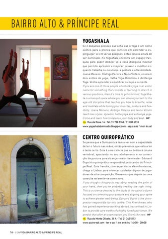 Bairro alto & príncipe real Yogashala Se é daquelas pessoas que acha que o Yoga é um nome exótico para a prática que consiste em aprender a espreguiçar-se em várias posições, então está na altura de ser iluminado. No Yogashala encontra um espaço tranquilo para poder dedicar-se a essa disciplina milenar que permite aprender a respirar, relaxar e meditar enquanto trabalha os músculos, a postura e a flexibilidade. Joana Menano, Rodrigo Pereira e Nuno Vintém, ensinam dois estilos de yoga, Hatha Yoga Dinâmico e Ashtanga Yoga. Venha aprender a equilibrar o corpo e a mente. If you are one of those people who thinks yoga is an exotic name for something that consists of learning to stretch in various positions, then it’s time to get informed. YogaShala is a tranquil space where you can devote yourself to this age-old discipline that teaches you how to breathe, relax and meditate while toning your muscles, posture and flexibility. Joana Menano, Rodrigo Pereira and Nuno Vintém teach two styles: dynamic hatha yoga and ashtanga yoga. Come and learn how to balance your body and soul. MP 7H