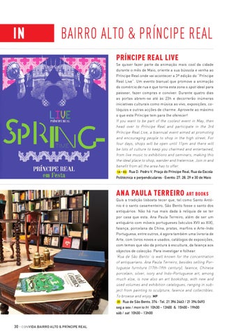Bairro alto & príncipe real Príncipe Real live Se quiser fazer parte da animação mais cool da cidade durante o mês de Maio, oriente a sua bússola e venha ao Príncipe Real onde vai acontecer a 3ª edição do “Príncipe Real Live”. Um evento bianual que promove a animação do comércio de rua e que torna esta zona o spot ideal para passear, fazer compras e conviver. Durante quatro dias as portas abrem-se até às 23h e decorrerão inúmeras iniciativas culturais como música ao vivo, exposições, colóquios e outras acções de charme. Aproveite ao máximo o que este Príncipe tem para lhe oferecer! If you want to be part of the coolest event in May, then head over to Príncipe Real and participate in the 3rd Príncipe Real Live, a biannual event aimed at promoting and encouraging people to shop in the high street. For four days, shops will be open until 11pm and there will be lots of culture to keep you charmed and entertained, from live music to exhibitions and seminars, making this the ideal place to shop, wander and fraternise. Join in and benefit from all the area has to offer. 1A