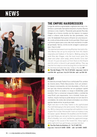 news The Empire Hairdressers Longe da caótica originalidade e agitação bairrista, o talentoso e premiado hairstylist brasileiro Aurélio Ramos começou o seu império. Passando pela pacata Rua das Chagas só a música mexida nos faz reparar no espaço clean e urbano onde Aurélio faz dos penteados, uma arte. Do badalado Facto para o Empire vai uma tesourada, e este artista ainda vai dar muito que falar. Dizem que o primeiro passo para uma vida mais excitante é mudar de penteado. Vamos, encha-se de coragem e passe por aqui. Hoje é o dia! The talented and award-winning Brazilian hairstylist Aurélio Ramos has set up his empire far from the chaotic originality and hubbub of the bairro. Walking along the quiet Rua das Chagas, only the loud music gives this clean and urban salon away, where Aurélio turns hair into art. It’s just one quick cut from Facto to the Empire and this artist is bound to get people talking. They say that the first step to a more exciting life is a new haircut. So, be brave and take that step. Today is the day! MP 8J