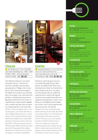 Com 38 anos ainda se é um jovem marialva, mas em “anos de restaurante” percebe-se que a fama que granjeou o Fidalgo, não é coisa pouca. Casa cheia de personagens da cidade, tem sempre uma mesinha para nos receber com o famoso Arroz de Pato, os Pastéis de massa tenra, Bacalhau à Minhota entre outras comidinhas bem lusas sempre regadas com o melhor que das uvas se espreme. Acabou de abrir com novo look! At 38, it’s still a youngster, but in “restaurant years” you realise that the renown Fidalgo has built up is no small thing. Full of city personalities, the establishment always has a small table waiting to receive you with its famous Duck Rice, Soft savoury pastries and Minhota-style Salted Cod among other genuine Portuguese dishes always washed down with the juice of the finest grapes. Just been refurbished!