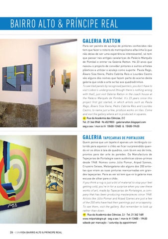 Bairro alto & príncipe real IN Galeria Ratton Para ver painéis de azulejo de pintores conhecidos não tem que fazer o roteiro do metropolitano alfacinha (o que não deixa de ser uma experiência interessante), só tem que passar nas antigas cavalariças do Palácio Marquês de Pombal e entrar na Galeria Ratton. Há 23 anos que nasceu o projecto de convidar pintores e outros artistas plásticos a utilizar o azulejo como suporte. Paula Rego, Álvaro Siza Vieira, Pedro Cabrita Reis e Lourdes Castro são alguns dos nomes que fazem parte do acervo desta galeria que onde a arte se faz aos quadradrinhos. To see tiled panels by recognised painters, you don’t have to visit Lisbon’s underground (though there’s nothing wrong with that), just visit Galeria Ratton in the coach house at the Palácio Marquês de Pombal. It’s 23 years since this project first got started, in which artists such as Paula Rego, Álvaro Siza Vieira, Pedro Cabrita Reis and Lourdes Castro, to name just a few, produce works on tiles. Come and visit the gallery where art is produced in squares. 5F