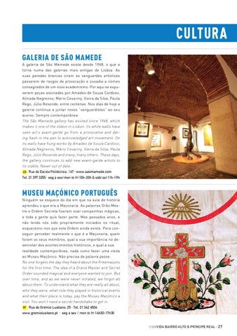 CULTURA IN Galeria de São Mamede A galeria de São Mamede existe desde 1968, o que a torna numa das galerias mais antigas de Lisboa. As suas paredes brancas viram as vanguardas artísticas passarem de rasgos de provocação e ousadia a nomes consagrados de um novo academismo. Por aqui se expuseram peças assinadas por Amadeo de Souza Cardoso, Almada Negreiros, Mário Cesariny, Vieira da Silva, Paula Rego, Júlio Resende, entre centenas. Nos dias de hoje a galeria continua a juntar novos “vanguardistas” ao seu acervo. Sempre contemporânea. The São Mamede gallery has existed since 1968, which makes it one of the oldest in Lisbon. Its white walls have seen art’s avant-garde go from a provocative and daring flash in the pan to acknowledged art movement. On its walls have hung works by Amadeo de Souza Cardoso, Almada Negreiros, Mário Cesariny, Vieira da Silva, Paula Rego, Júlio Resende and many, many others. These days, the gallery continues to add new avant-garde artists to its stable. Never out of date. 2B