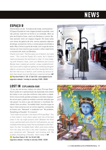 “O seu bar-de-terraço indiano em pleno Príncipe Real.” Assim podia ser a apresentação da esplanada mais shanti de Lisboa e com uma das melhores vista sobre a cidade. Entre música hindi, paredes pintadas e coloridos chapéusde-sol em pano, podemos meditar comendo refeições que não pesam na alma e que até deliciam o trombudo Ganhesh. Para um efeito “Incredible Índia” escolha roupa na loja e meta conversa com os outros viajantes, começando as frases com “Namasté” e acabando com “No problem, Everything is Possible”. E é mesmo! “Your Indian terrace bar in the heart of Príncipe Real.” This is how Lisbon’s most shanti eatery with one of the best views in the city might present itself. Between the Hindi music, painted walls and colourful cloth parasols, you can meditate while eating meals that would please sullen Ganhesh. For that “Incredible Índia” effect, pick some clothes from the shop and chat to the other travellers, starting your sentences with “Namasté” and finishing with “No problem, Everything is Possible”. And it really is! MP 7C