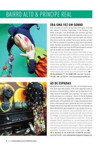 ÀS DE ESPADAS Verdadeiramente em segunda mão, só se vendem luvas, mas dizer que este vestido lindo é em segundo corpo já tornava a coisa estranha, melhor que se diga que é vintage, palavra encantada que significa “um igual a este já não arranjas tu, ó invejosa”. Assim no Às de Espadas temos de tudo para segundas cabeças e terceiros e quartos pés. Uma perdição em roupa e acessórios para quem, mais que primeiro, gosta de ser único. Há maquilhagem Besame (inspirada nos anos 40) e workshops La Belle Bombshell, para despertar a pin-up que há em si. Only gloves can really be sold secondhand, but to call a pretty dress ‘secondbody’ sounds a bit odd. Hence the use of ‘vintage’, a charming word which means, “Enjoy looking, ‘cos you’ll never find another one like this.” At Às de Espadas there’s everything for second heads and third and fourth feet. This is a mecca for clothes and accessories for those who like to look unique. There’s also Besame make-up (inspired by the 40s) and La Belle Bombshell workshops to awaken the pin-up model inside you. MP 8F