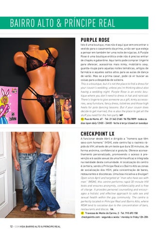 BAIRRO ALTO & PRÍNCIPE REAL PURPLE ROSE Isto é uma boutique, mas não é aqui que vem encontrar o vestido para o casamento da prima, a não ser que esteja a pensar em também ter uma noite de núpcias. A Purple Rose é uma boutique erótica onde não é preciso entrar de chapéu e gabardine. Aqui tanto pode comprar lingerie para oferecer, acessórios mais kinky, mobiliário sexy, guarda-roupa para aquelas noites temáticas, artigos de farmácia e aqueles saltos altos para as aulas de dança de varão. Mas se a prima casar, pode cá vir buscar as coisas para a despedida de solteira. This is a boutique, but it’s not the place to find a dress for your cousin’s wedding, unless you’re thinking about also having a wedding night. Purple Rose is an erotic boutique where you don’t need to dress in hat and raincoat. There’s lingerie to give someone as a gift, kinky accessories, sexy furniture, fancy dress, toiletries and those high heels for pole dancing lessons. But if your cousin does decide to get married, this is also the place to get all the stuff you need for the hen party. MP 9H