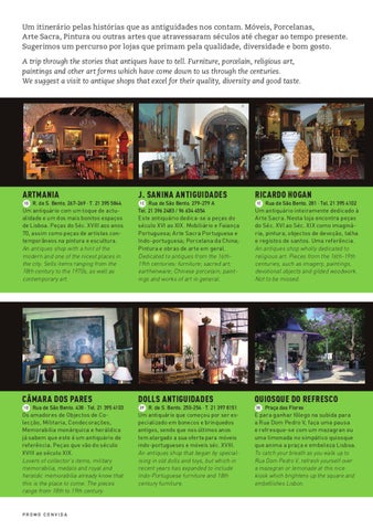 Um itinerário pelas histórias que as antiguidades nos contam. Móveis, Porcelanas, Arte Sacra, Pintura ou outras artes que atravessaram séculos até chegar ao tempo presente. Sugerimos um percurso por lojas que primam pela qualidade, diversidade e bom gosto. A trip through the stories that antiques have to tell. Furniture, porcelain, religious art, paintings and other art forms which have come down to us through the centuries. We suggest a visit to antique shops that excel for their quality, diversity and good taste.