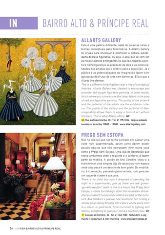 BAIRRO ALTO & PRÍNCIPE REAL ALLARTS GALLERY Esta é uma galeria diferente, nada de palavras caras e teorias conceptuais para descrevê-la. A Allarts Gallery foi criada para encorajar e promover a pintura autodidacta de base figurativa, ou seja, é aqui que se vem ver os novos talentos emergentes no que diz respeito à pintura naif e figurativa. A qualidade da obra e as potencialidades dos artistas são o critério para a exposição. Já o público e as potencialidades da imaginação fazem com que possa desfrutar da Arte sem barreiras. É isto que a Allarts lhe oferece. This is a different kind of gallery that’s free of conceptual theories. Allarts Gallery was created to encourage and promote self-taught figurative painting. In other words, this is where you come to see the latest talent in the area of naïf and figurative painting. The quality of the artwork and the potential of the artists are the exhibition criteria. The quality of the visitors and the potential of their imagination allows them to enjoy a form of art without frontiers. That is what Allarts offers. MP 10H