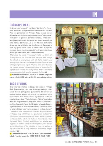 IN PRÍNCIPE REAL Se dissermos “enxoval”, “rendas”, “bordados” e “naperons” em que é que pensa imediatamente? Na sua avó! Pois nós pensamos em Príncipe Real, porque apesar desta rua ser sinónimo de palavras como “vanguarda”, “estilistas” e “galerias contemporâneas”, ainda resistem lojas tradicionais do tempo em que a sua avó era uma menina de tranças. Já lá vão 90 anos de história desde que Maria Cristina Martins Gomes de Castro abriu esta loja para servir tanto as casas reais europeias, como as jovens meninas casadoiras. E assim continua, pois o que é excelente, está sempre na moda. What does the word “trousseau” make you think of? Granny! For us, its Príncipe Real, because even though this street is synonymous with all that’s modern and avant-garde, there are still a few shops left from the time when your gran was a girl. 90 years have gone by since the owner opened this establishment to serve the European royal houses and young ladies. And it’s still here, because what is truly good is always in fashion. MP 4B
