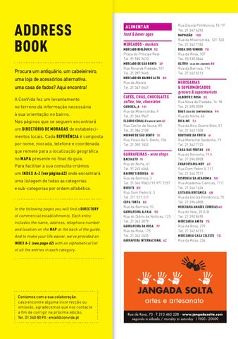 ADDRESS BOOK Procura um antiquário, um cabeleireiro, uma loja de acessórios alternativa, uma casa de fados? Aqui encontra! A ConVida fez um levantamento no terreno da informação necessária à sua orientação no bairro. Nas páginas que se seguem encontrará um DIRECTÓRIO DE MORADAS de estabelecimentos locais. Cada REFERÊNCIA é composta por nome, morada, telefone e coordenada que remete para a localização geográfica no MAPA presente no final do guia. Para facilitar a sua consulta criámos um INDEX A-Z (ver página 62) onde encontrará uma listagem de todas as categorias e sub-categorias por ordem alfabética.