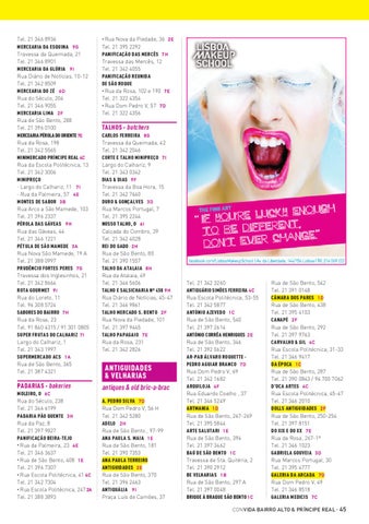 Rua de São Bento, 542 Tel. 21 391 0148 CÂMARA DOS PARES 1 D Rua de São Bento, 438 Tel. 21 395 4103 CANAPÉ 2 F Rua de São Bento, 292 Tel. 21 397 9763 CARVALHO & GIL 4 C Rua Escola Politécnica, 31-33 Tel. 21 346 9417 DA ÉPOCA 1 C Rua de São Bento, 287 Tel. 21 390 0843 / 96 700 7062 D’OCA ARTES 4 C Rua Escola Politécnica, 45-47 Tel. 21 346 2010 DOLLS ANTIGUIDADES 2 F Rua de São Bento, 250-254 Tel. 21 397 8151 DO XIX E DO XX 7 E Rua da Rosa, 267-1º Tel. 21 346 1023 GABRIELA GOUVEIA 3 D Rua Marcos Portugal, 30 Tel. 21 395 4777 GALERIA DA ARCADA 7 D Rua Dom Pedro V, 49 Tel. 21 346 8518 GALERIA MEDICIS 7 C