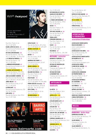 ASSOCIAÇÕES & FEDERAÇÕES associations & federations ASSOCIAÇÃO COMERCIANTES RUA DE SÃO BENTO 1 C www.ruadesaobento. blogspot.com ASSOCIAÇÃO 25 DE ABRIL 1 0 H Rua da Misericórdia, 95 Tel. 21 324 1420 ASSOCIAÇÃO DE COMERCIANTES DO BAIRRO ALTO 8 G http://bairroaltocomerciantes.blogspot.com ASSOCIAÇÃO LISBOA CLUBE RIO DE JANEIRO 8 G Rua da Atalaia, 120 Tel. 21 342 7276 ASSOCIAÇÃO LISBONENSE DE PROPRIETÁRIOS 7 C Rua Dom Pedro V, 82-2º Tel. 21 340 2000 ASSOCIAÇÃO SINFÓNICA DA LUSOFONIA 7 F Rua da Rosa, 145 - 147 CULTURBICA 6 J Rua do Almada, 36 GRÉMIO LUSITANO 8 F Rua do Grémio Lusitano , 25 Tel. 21 342 4506 UNIÃO DAS CIDADES CAPITAIS DE LÍNGUA PORTUGUESA 1 B Rua de São Bento, 640 Tel. 21 385 2596