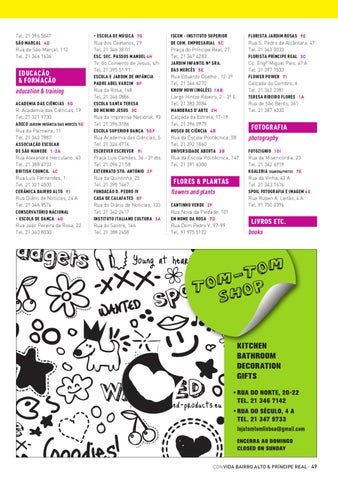 EDUCAÇÃO & FORMAÇÃO education & training ACADEMIA DAS CIÊNCIAS 5G R. Academia das Ciências, 19 Tel. 21 321 9730 ADECO JARDIM INFÂNCIA DAS MERCÊS 5 E Rua da Palmeira, 11 Tel. 21 342 7887 ASSOCIAÇÃO ESCOLAR DE SÃO MAMEDE 1-2A Rua Alexandre Herculano, 63 Tel. 21 388 4733 BRITISH COUNCIL 4C Rua Luís Fernandes, 1 Tel. 21 321 4500 CERÂMICA BAIRRO ALTO 91 Rua Diário de Notícias, 24 A Tel. 21 346 9576 CONSERVATÓRIO NACIONAL ESCOLA DE DANÇA 6G Rua João Pereira da Rosa, 22 Tel. 21 340 8030