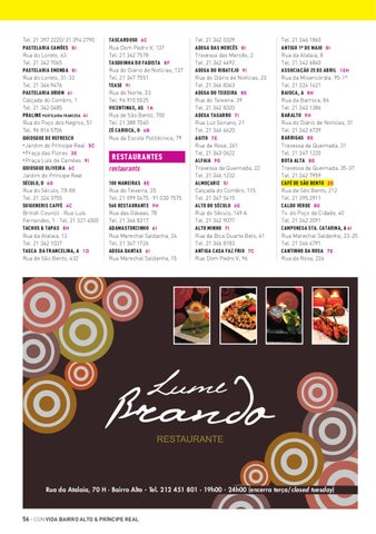 TASCARDOSO 6 C Rua Dom Pedro V, 137 Tel. 21 342 7578 TASQUINHA DO FADISTA 8 F Rua do Diário de Notícias, 137 Tel. 21 347 7551 TEASE 9 I Rua do Norte, 33 Tel. 96 910 5525 VICENTINAS, AS 1 A Rua de São Bento, 700 Tel. 21 388 7040 ZÉ CARIOCA, O 4 B Rua da Escola Politécnica, 79