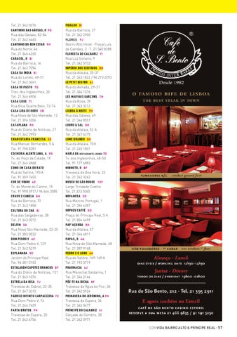 Bairro Alto Hotel · Praça Luís de Camões, 2 · T. 21 340 8288 FLORESTA DO CALHARIZ 7 I Rua Luz Soriano, 9 Tel. 21 342 5733 IMPÉRIO DOS SENTIDOS 8 H Rua da Atalaia, 35-37 Tel. 21 343 1822 / 96 273 2293 LE PETIT BISTRO 6 J Rua do Almada, 29-31 Tel. 21 346 1376 LES MAUVAIS GARÇONS 7 H Rua da Rosa, 39 Tel. 21 343 3212 LISBOA À NOITE 9 H Rua das Gáveas, 69 Tel. 21 346 8557 LOURO & SAL 8 H Rua da Atalaia, 53 A Tel. 21 347 6275 LUME BRANDO 8 H Rua da Atalaia, 70H Tel. 21 245 1801 MARIA BA RESTAURANTE-LOUNGE 7G Tv. dos Inglesinhos, 48-50 Tel. 91 177 6883 MINHOTO, O 8 F Travessa da Boa Hora, 23 Tel. 21 342 3262 MUSEU DE SÃO ROQUE 1 0 F Largo Trindade Coelho Tel. 21 323 5065 NOVAMESA 3 D Rua Marcos Portugal, 1 Tel. 21 396 6287 ORPHEU CAFFÉ 5 D Praça do Príncipe Real, 5 A Tel. 21 804 4499 PAP’AÇORDA 8 H Rua da Atalaia, 57 Tel. 21 346 4811 PAPAS, O 4 A Rua Nova de São Mamede, 68 Tel. 21 387 9148 PEDRO E O LOBO 4 A Rua do Salitre, 169-169 A Tel. 21 193 3719 PHARMACIA 6 J Rua Marechal Saldanha, 1 Tel. 21 346 2146 PÕE-TE NA BICHA 8 F Travessa da Água da Flor, 36 Tel. 21 342 5924 PRIMAVERA DO JERÓNIMO, A 9 H Travessa da Espera, 34 Tel. 21 342 0477 PRÍNCIPE DO CALHARIZ 6 I Calçada do Combro, 28 Tel. 21 342 0971 CON VIDA BAIRRO ALTO & PRÍNCIPE REAL ·