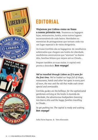 EDITORIAL Viajamos por Lisboa como se fosse a nossa primeira vez. Trazemos na bagagem lojas, restaurantes, hotéis, entre outros lugares incontornáveis de cada bairro. Novidades ou memórias de protagonistas que tornam cada rua um lugar especial e de visita obrigatória. Os Guias ConVida são os bagageiros: de cavalheiros sofisticados que chegam aos hotéis da Liberdade, mochileiros aventureiros que “aterram” no Bairro Alto, famílias felizes que viajam até ao Chiado... Prepare também as suas malas. A capital está pronta a descobrir. Bon voyage!