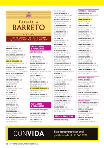 FARMÁCIAS · pharmacies FARMÁCIA ALBANO 4 C Rua da Escola Politécnica, 59 Tel. 21 342 6750 FARMÁCIA BARRETO 9 I Rua do Loreto, 24 Tel. 21 342 7284 FARMÁCIA CAMÕES 9 I Praça Luís de Camões, 24 Tel. 21 342 2798 FARMÁCIA CASTRO 1 D Rua de São Bento, 199 A Tel. 21 396 0513 FARMÁCIA CONFIANÇA 3 E Praça das Flores, 59 Tel. 21 395 2401 FARMÁCIA DO COMBRO 5 I Calçada do Combro, 80 Tel. 21 322 5542 FARMÁCIA MICAEL 2 F Rua de São Bento, 246 Tel. 21 396 2162 FARMÁCIA OLIVEIRA 6 C Rua Dom Pedro V, 125 Tel. 21 324 0419 / 20 FARMÁCIA PRÍNCIPE REAL 5 C Rua da Escola Politécnica, 16 Tel. 21 342 5455 FARMÁCIA SÃO MAMEDE 3 B Rua Escola Politécnica, 82 B Tel. 21 396 0280
