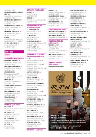 SERVIÇOS services ARTES GRÁFICAS graphic arts BOUTIQUE A. FERNANDES 5I Calçada do Combro, 91-93 Tel. 21 150 8636 CABRAL & ALVES DOURADOR 4I Rua Marcos Marreiros, 22 Tel. 21 390 8767 CARLOS GUERREIRO ( ENCADERNADOR DOURADOR) 7F Rua de São Boaventura, 4-6 Tel. 21 346 0864 GRAVO PLOT 3I Rua Poiais de São Bento, 67 Tel. 21 393 2240 ILÍDIO ANTÓNIO ENCADERNADOR 7F Rua da Vinha, 13 A Tel. 21 347 2216 LOJA DAS MAQUETAS 3-4G Rua Eduardo Coelho , 80 Tel. 21 342 3423 TRAÇA POMBALINA 7F Rua da Rosa, 179 Tel. 93 666 8522