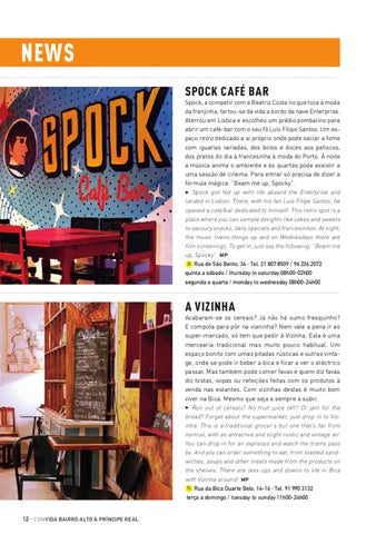 NEWS SPOCK CAFÉ BAR Spock, a competir com a Beatriz Costa no que toca à moda da franjinha, fartou-se da vida a bordo da nave Enterprise. Aterrou em Lisboa e escolheu um prédio pombalino para abrir um café-bar com o seu fã Luís Filipe Santos. Um espaço retro dedicado a si próprio onde pode saciar a fome com iguarias variadas, dos bolos e doces aos petiscos, dos pratos do dia à francesinha à moda do Porto. À noite a música anima o ambiente e às quartas pode assistir a uma sessão de cinema. Para entrar só precisa de dizer a fórmula mágica: “Beam me up, Spocky”. 3 Spock got fed up with life aboard the Enterprise and landed in Lisbon. There, with his fan Luís Filipe Santos, he opened a café/bar dedicated to himself. This retro spot is a place where you can sample delights like cakes and sweets to savoury snacks, daily specials and francesinhas. At night, the music livens things up and on Wednesdays there are film screenings. To get in, just say the following: “Beam me up, Spocky”. MP 2I