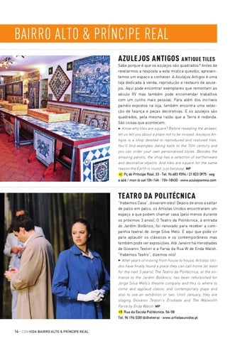 BAIRRO ALTO & PRÍNCIPE REAL AZULEJOS ANTIGOS ANTIQUE TILES Sabe porque é que os azulejos são quadrados? Antes de revelarmos a resposta a esta mística questão, apresentamos um espaço a conhecer. A Azulejos Antigos é uma loja dedicada à venda, reprodução e restauro de azulejos. Aqui pode encontrar exemplares que remontam ao século XV mas também pode encomendar trabalhos com um cunho mais pessoal. Para além dos incríveis painéis expostos na loja, também encontra uma selecção de faiança e peças decorativas. E os azulejos são quadrados, pela mesma razão que a Terra é redonda. São coisas que acontecem. 3 Know why tiles are square? Before revealing the answer, let us tell you about a place not to be missed. Azulejos Antigos is a shop devoted to reproduced and restored tiles. You’ll find examples dating back to the 15th century and you can order your own personalised styles. Besides the amazing panels, the shop has a selection of earthenware and decorative objects. And tiles are square for the same reason the Earth is round: just because. MP 6C