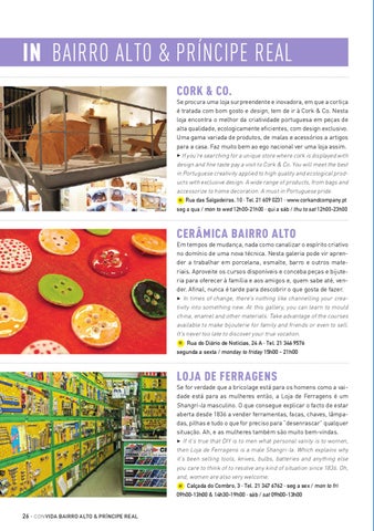 IN BAIRRO ALTO & PRÍNCIPE REAL CORK & CO. Se procura uma loja surpreendente e inovadora, em que a cortiça é tratada com bom gosto e design, tem de ir à Cork & Co. Nesta loja encontra o melhor da criatividade portuguesa em peças de alta qualidade, ecologicamente eficientes, com design exclusivo. Uma gama variada de produtos, de malas e acessórios a artigos para a casa. Faz muito bem ao ego nacional ver uma loja assim. 3 If you’re searching for a unique store where cork is displayed with design and fine taste pay a visit to Cork & Co. You will meet the best in Portuguese creativity applied to high quality and ecological products with exclusive design. A wide range of products, from bags and accessorize to home decoration. A must in Portuguese pride. 9I