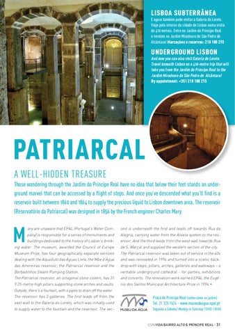 PATRIARCAL A WELL-HIDDEN TREASURE Those wandering through the Jardim do Príncipe Real have no idea that below their feet stands an under ground marvel that can be accessed by a flight of steps. And once you’ve descended what you’ll find is a reservoir built between 1860 and 1864 to supply the precious liquid to Lisbon downtown area. The reservoir (Reservatório da Patriarcal) was designed in 1856 by the French engineer Charles Mary.