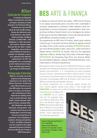 BES ARTE & FINANÇA 3 Situado no financial district de Lisboa, o BES Arte & Finança é um espaço vocacionado para o encontro entre criatividade e inovação, vanguardismo e ecletismo. Nele coabitam a arte contemporânea e serviços financeiros, representando o forte compromisso do Banco Espírito Santo com a divulgação da cultura. É aqui que se encontra depositado o acervo da colecção de fotografia BESart, acessível ao público em geral. Da programação do BES Arte & Finança, fazem parte eventos culturais que o inscrevem de forma distinta na agenda cultural da cidade. Entre muitos outros, já acolheu EXPOSIÇÕES de artistas como Gérard Castello-Lopes, João Louro, Julião Sarmento e Miguel Palma; CONCERTOS de Jacinta, João Gil, The Legendary Tigerman e Márcia, Amália Hoje, Otros Aires e Nouvelle Vague;