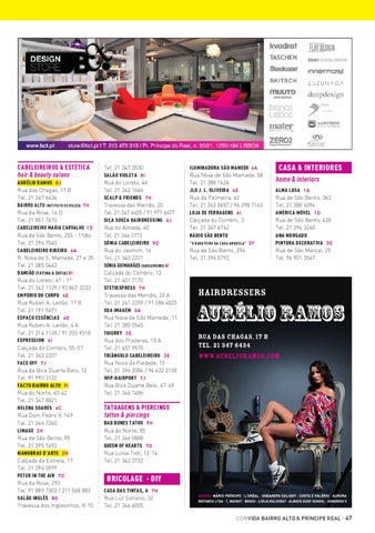 AURÉLIO RAMOS 8J Rua das Chagas, 17 B Tel. 21 347 6434 BAIRRO ALTO INSTITUTO DE BELEZA 7H Rua da Rosa, 14 D Tel. 21 801 7610 CABELEIREIRO MARIA CARVALHO 1 D Rua de São Bento, 255 - 1ºdto Tel. 21 396 7540 CABELEIREIRO RIBEIRO 4A R. Nova de S. Mamede, 27 e 35 Tel. 21 385 0443 DAMIÃO (FÁTIMA & SOFIA) 8I Rua do Loreto, 61 - 1º Tel. 21 342 1129 / 93 867 3233 EMPÓRIO DO CORPO 4E Rua Ruben A. Leitão, 17 B Tel. 21 191 9491 ESPAÇO ESSÊNCIAS 4E Rua Ruben A. Leitão, 4 A Tel. 21 314 1128 / 91 255 9318 EXPRESSION 6I Calçada do Combro, 55-57 Tel. 21 343 2207 FACE OFF 7J Rua da Bica Duarte Belo, 12 Tel. 91 990 3132 FACTO BAIRRO ALTO 9I Rua do Norte, 40-42 Tel. 21 347 8821 HELENA SOARES 6C Rua Dom Pedro V, 149 Tel. 21 346 7240 LIMAGE 2H Rua de São Bento, 95 Tel. 21 395 1493 MANOBRAS D’ARTE 2H Calçada da Estrela, 17 Tel. 21 396 0979 PETER IN THE AIR 7D Rua da Rosa, 293 Tel. 91 889 7303 / 211 568 883 SALÃO INGLÊS 8G Travessa dos Inglesinhos, 8-10