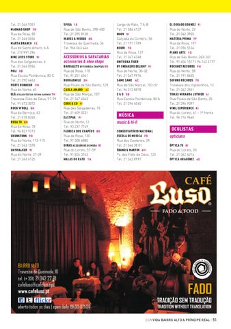 Tel. 21 346 9351 MAOMAO SHOP 7G Rua da Rosa, 85 Tel. 21 346 0656 MARTA BRANCO 1E Rua de Santo Amaro, 6 A Tel. 210 991 296 NINE LIVES STORE 9I Rua das Salgadeiras, 6 Tel. 21 346 0926 POLI 3B Rua Escola Politécnica, 80 C Tel. 21 390 6463 PORTE BONHEUR 9H Rua do Norte, 60 QLÃ ATELIER TÊXTEIS FÁTIMA GAVINHO 7H Travessa Fiéis de Deus, 97-99 Tel. 91 473 3872 ROCK‘N’ROLL 8H Rua da Barroca, 63 Tel. 21 018 8265 ROSA 78 8H Rua da Rosa, 78 Tel. 96 821 9213 SKUNKFUNK 9G Rua do Norte, 113-115 Tel. 21 342 1578 SKYWALKER 9I Rua do Norte, 37-39 Tel. 21 346 6125