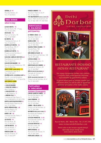 ONDE DORMIR where to sleep ALFACE HOSTEL 9G Rua do Norte, 98 - 1º esq. Tel. 21 343 3293 ANJO AZUL 7G Rua Luz Soriano, 75 Tel. 21 347 8069 BA HOSTEL 8E Travessa da Cara, 6 - 8 Tel. 21 346 8126 BAIRRO ALTO HOSTEL 7D Rua da Rosa, 295-1º Tel. 21 246 7643 BAIRRO ALTO HOTEL 9J Praça Luís de Camões, 2 Tel. 21 340 8288 CASA DAS JANELAS COM VISTA 6 E Rua Nova do Loureiro, 35 Tel. 21 342 9110 CASA DE SÃO MAMEDE 3B Rua da Escola Politécnica, 159 Tel. 21 396 3166 EQUITY POINT LISBOA HOSTEL 9C Travessa do Fala-Só, 9 Tel. 21 801 8211 EVIDÊNCIA STA. CATARINA LIGHT 6 I Rua Dr. Luís de Almeida e Albuquerque, 6 · T. 21 346 6106 GUESTHOUSE LISBON Tel. 91 417 6969 • CASA DO BAIRRO • CASAS DE LISBOA 4J Beco Caldeira, 1 • CASA DO PÁTIO 4J Tv. da Caldeira, 19 • RIBEIRA TEJO 7I Travessa do São Paulo, 5 Tel. 21 805 8015 / 91 331 2778 HOSTEL OASIS BACKPACKERS 5J Rua de Santa Catarina, 24 Tel. 21 347 8044 HOTEL PRÍNCIPE REAL 6B Rua da Alegria, 53 Tel. 21 340 7350 HOUSE 4 BA 8E Travessa de São Pedro, 9 Tel. 21 343 0345 LES SUITES 7H Rua da Rosa, 35 Tel. 21 343 3212 LISB’ON HOSTEL 8J Rua do Ataíde, 7 Tel. 21 346 7413 PENSÃO GLOBO 8E Rua do Teixeira, 37 Tel. 21 346 2279