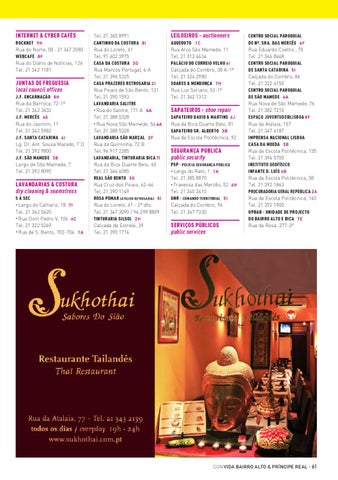Tel. 21 365 8991 CANTINHO DA COSTURA 8 I Rua do Loreto, 61 Tel. 91 602 3975 CASA DA COSTURA 3 D Rua Marcos Portugal, 6 A Tel. 21 396 5325 CASA PRAZERES RETROSARIA 2 I Rua Poiais de São Bento, 131 Tel. 21 390 1593 LAVANDARIA SALITRE • Rua do Salitre, 171 A 4 A Tel. 21 388 5328 • Rua Nova São Mamede, 54 4 A Tel. 21 388 5328 LAVANDARIA SÃO MARÇAL 2 F Rua da Quintinha, 72 B Tel. 96 917 2285 LAVANDARIA, TINTURARIA BICA 7I Rua da Bica Duarte Belo, 60 Tel. 21 346 4085 REAL SÃO BENTO 3 G Rua Cruz dos Poiais, 62-64 Tel. 21 390 1149 ROSA POMAR (ATELIER-RETROSARIA) 8 I Rua do Loreto, 61 - 2º dto. Tel. 21 347 3090 / 96 299 8809 TINTURARIA SILSOL 2 H Calçada da Estrela, 39 Tel. 21 390 1774