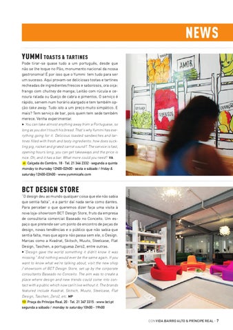 BCT DESIGN STORE “O design deu ao mundo qualquer coisa que ele não sabia que sentia falta”, e a partir daí nada seria como dantes. Para perceber o que queremos dizer faça uma visita à nova loja-showroom BCT Design Store, fruto da empresa de consultoria comercial Baseado no Conceito. Um espaço que pretende ser um ponto de encontro de peças de design, novas tendências e o público que não sabia que sentia falta, mas que agora não passa sem ele, o Design. Marcas como a Kvadrat, Skitsch, Muuto, Steelcase, Flat Design, Taschen, a portuguesa Zero2, entre outras. 3“Design gave the world something it didn’t know it was