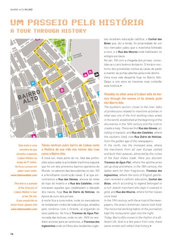 UM PASSEIO PELA HISTÓRIA A TOUR THROUGH HISTORY ses recebiam educação católica, o Cunhal das Bolas que, diz a lenda, foi propriedade de um rico mercador judeu que o mantinha folheado a ouro, e a Rua dos Mouros onde habitavam os antigos escravos. No séc. XIX com a chegada dos jornais, consolida-se o cariz boémio do bairro. O horário nocturno dos jornalistas motiva as casas de pasto a manter as portas abertas pela noite dentro. Uma nova vida desperta hoje no Bairro Alto. Daqui a uns anos as mesmas ruas contarão esta história.•