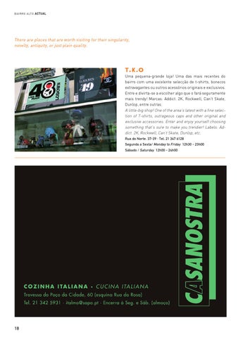 Uma pequena-grande loja! Uma das mais recentes do bairro com uma excelente selecção de t-shirts, bonecos extravagantes ou outros acessórios originais e exclusivos. Entre e divirta-se a escolher algo que o fará seguramente mais trendy! Marcas: Addict. 2K, Rockwell, Can’t Skate, Dunlop, entre outras. A little-big shop! One of the area’s latest with a fine selection of T-shirts, outrageous caps and other original and exclusive accessories. Enter and enjoy yourself choosing something that’s sure to make you trendier! Labels: Addict. 2K, Rockwell, Can’t Skate, Dunlop, etc. Rua do Norte, 37-39 · Tel. 21 347 6128 Segunda a Sexta/ Monday to Friday 12h30 - 23h00 Sábado / Saturday 12h00 - 24h00