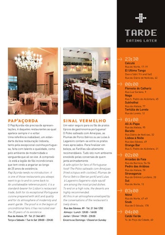 Um valor seguro para os fãs de pratos típicos da gastronomia portuguesa! O Polvo salteado com Ameijoas, as Plumas de Porco Ibérico ou as Lulas à Lagareiro contam-se entre os pratos mais apreciados. Para finalizar em beleza, as Farófias são altamente recomendáveis. Tudo isto num ambiente envolvido pelas conversas de quem janta animadamente. A safe option for fans of Portuguese food! The Polvo salteado com Ameijoas (fried octopus with cockles), Plumas de Porco Ibérico (Iberian pork) and Lulas à Lagareiro (lagareiro-style squid) are among the most prized dishes. To end on a high note, the deserts are highly recommended. All this in an atmosphere enveloped by the conversations of the restaurant’s lively diners. Rua das Gáveas, 89 · Tel. 21 346 1252 Almoço / Lunch 12h30 - 14h30