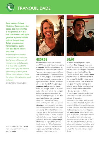 Quando decidiu viver em Portugal, em 1997, esta londrina de gema abriu o FactoLab, um conceito inovador de cabeleireiro, e escolheu o Bairro Alto “porque era uma zona jovem, diferente e movimentada”. O primeiro foi na Rua da Rosa, seguiu-se outro no Cais da Pedra, renovado recentemente, e agora mudaram a morada do Bairro Alto para a Rua do Norte, zona que Josie Georgia Prior, conhecida de todos por George, adora. “É espectacular estar aqui, tem muita energia.” Quando sai à noite, gosta de ir ao restaurante Esperança e ao bar Bed���� room, vizinhos da sua nova rua. When this Londoner decided to move to Portugal in 1997, she opened FactoLab, a new concept in hairdressing, and chose Bairro Alto “because it was young, different and happening”. The first was in Rua da Rosa, followed by another in Cais da Pedra, recently refurbished, and now they’ve moved to Rua do Norte, which Josie Georgia Prior loves. “It’s great here; there’s loads of energy.” When he goes out at night, he heads for the restaurant Esperança and the bar Bedroom, neighbours on his new street.