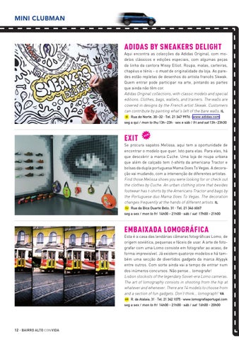 Adidas by Sneakers Delight Aqui encontra as colecções da Adidas Original, com modelos clássicos e edições especiais, com algumas peças da linha da cantora Missy Elliot. Roupa, malas, carteiras, chapéus e ténis - o must de originalidade da loja. As paredes estão repletas de desenhos do artista francês Skwak. Quem entrar pode participar na arte, pintando as partes que ainda não têm cor. Adidas Original collections, with classic models and special editions. Clothes, bags, wallets, and trainers. The walls are covered in designs by the French artist Skwak. Customers can contribute by painting what’s left of the bare walls. il 6I