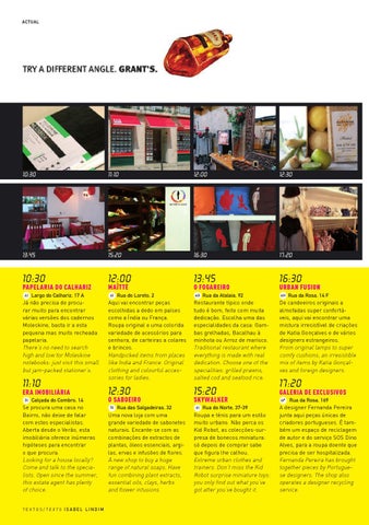 Galeria de exclusivos 4F Rua da Rosa, 169 A designer Fernanda Pereira junta aqui peças únicas de criadores portugueses. É também um espaço de reciclagem de autor e do serviço SOS Dino Alves, para a roupa doente que precisa de ser hospitalizada. Fernanda Pereira has brought together pieces by Portuguese designers. The shop also operates a designer recycling service.
