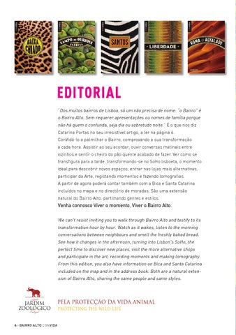 EDITORIAL “Dos muitos bairros de Lisboa, só um não precisa de nome: “o Bairro” é o Bairro Alto. Sem requerer apresentações ou nomes de família porque não há quem o confunda, seja dia ou sobretudo noite.” É o que nos diz Catarina Portas no seu irresistível artigo, a ler na página 6. ConVidá-lo a palmilhar o Bairro, comprovando a sua transformação a cada hora. Assistir ao seu acordar, ouvir conversas matinais entre vizinhos e sentir o cheiro do pão quente acabado de fazer. Ver como se transfigura para a tarde, transformando-se no SoHo lisboeta, o momento ideal para descobrir novos espaços, entrar nas lojas mais alternativas, participar da Arte, registando momentos e fazendo lomografias. A partir de agora poderá contar também com a Bica e Santa Catarina incluídos no mapa e no directório de moradas. São uma extensão natural do Bairro Alto, partilhando gentes e estilos.