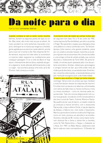 fés. Mas neste, são muito mais as que se abrem. As luzes acendem-se como lanternas marcando o trajecto, distingue-se a música que angaria a clientela, gente agitada que se aventura ruelas adentro, pronta para o que vier e estiver a dar. Nas vésperas de fimde-semana, esquinas há onde todos se acotovelam e é preciso saber esgueirar-se cordatamente para conseguir passagem. E se a noite do Bairro é hoje assim, intensamente democrática, explosão de gente e algazarra, tendo alterado definitivamente a vida e o lugar, isso acontece porque uma noite, já lá vão 25 anos, tudo começou a mudar.