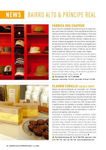 ClAudio Corallo Cacao e Caffé Depois da democratização do chocolate, em infinitas variações, sabores e marcas, eis que se volta ao elogio da pureza original. O cacao é consagrado como iguaria nesta pequena e tentadora loja. Claudio Corallo traz, das suas plantações de São Tomé e Príncipe para o Príncipe Real, o melhor cacau e o mais fino café. Só para abrir o apetite pense em gelados e sorvetes, tabletes puras, com laranja ou gengibre, tudo feito artesanalmente. O segredo fica guardado, mas os chocolates e o café expresso com pepitas, são só para si. Chocolate is everywhere, in endless variations, tastes and brands, so the time has come to return it to its rightful place. Cocoa is regarded as a delicacy in this alluring little shop. Claudio Corallo imports the best cacao and finest coffee from his plantations in São Tomé and Príncipe. Just to whet your appetite, think of handmade ice creams and sorbets and bars of pure chocolate with orange and ginger. The secret is carefully guarded, but the chocolates and espresso are just for you. M 4C