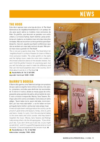 news The Hood Esta não é apenas mais uma loja de ténis. A The Hood (abreviatura de neighbourhood=bairro) é um pedaço de céu para quem adora os modelos mais exclusivos da Nike. Os grafittis, que decoram as paredes num estilo urbano, e a música hiphop, fazem desfilar, pelas prateleiras em madeira, os modelos mais retro das colecções limitadas. Não vai encontrar os ténis perfeitos para fazer desporto, mas sim, aqueles que fazem a diferença e que não se vendem em mais lado nenhum do país. Não pense mais nisso e just do it in The Hood! This is not just a sports shoe shop. The Hood (short for ‘neighbourhood’) is a drop of heaven for lovers of Nike’s more exclusive models. The urban grafitti on the walls and the hiphop music make the more retro models in the limited collections dance on the wooden shelves. You won’t find the perfect trainers for practising sport, but you will find what you need to make the difference and that can’t be found anywhere else in the country. Don’t think about it just do it, in The Hood! M 9H