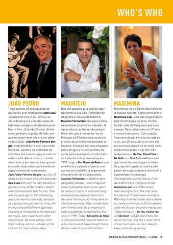 Movimenta-se no Bairro Alto como se lá tivesse nascido. Todos conhecem a Maximina Leal, uma das responsáveis pela dinamização da zona. Porém, foi São João da Pesqueira que a viu crescer. Para Lisboa veio no 11º ano e nunca mais voltou. Com a ajuda financeira do pai e muita vontade de criar, aos 20 anos abriu um bar que pouco tempo depois se tornaria num restaurante árabe. Hoje tem três restaurantes – Be You, Found You e Be Gold, um Bed & Breakfast e dois apartamentos que aluga a turistas. Os projectos ligados à cozinha não param de surgir e deverá continuar a surpreender os lisboetas. She negotiates Bairro Alto as if she were born there. Everyone knows Maximina Leal, one of the area’s main driving forces. She only came to Lisbon at 17, and never went back. With help from her father and a desire to create something, at 20 she opened a bar which soon became a restaurant. Today she has 3 – Be You, Found You and Be Gold - a B&B and 2 flats she lets to tourists. But she’s never short of new food ideas, so she’s likely to keep Lisbonites guessing. bairro alto & príncipe real con vida · 19