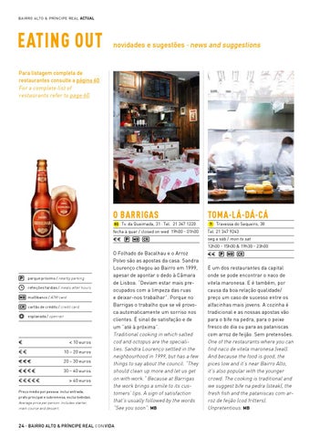 O Folhado de Bacalhau e o Arroz Polvo são as apostas da casa. Sandra Lourenço chegou ao Bairro em 1999, apesar de apontar o dedo à Câmara de Lisboa. “Deviam estar mais preocupados com a limpeza das ruas e deixar-nos trabalhar”. Porque no Barrigas o trabalho que se vê provoca automaticamente um sorriso nos clientes. É sinal de satisfação e de um “até à próxima”. Traditional cooking in which salted cod and octopus are the specialities. Sandra Lourenço settled in the neighbourhood in 1999, but has a few things to say about the council. “They should clean up more and let us get on with work.” Because at Barrigas the work brings a smile to its customers’ lips. A sign of satisfaction that’s usually followed by the words “See you soon”. MB