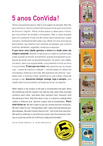 5 anos ConVida ! Temos uma proposta para si. Não é uma viagem ao passado. Nem tão pouco ao futuro. Temos muitas histórias para contar que nos enchem de ternura e orgulho. Temos muitos planos e ideias para o futuro, que nos enchem de vontade e entusiasmo. Mas a nossa proposta para si é o presente. É que nos dê o braço hoje e passeie por Lisboa connosco. Conhecemos bem estas ruas. Afinal, há cinco anos que as percorremos, que falamos com centenas de pessoas, que ouvimos histórias, desabafos, sugestões, sentenças e aplausos.