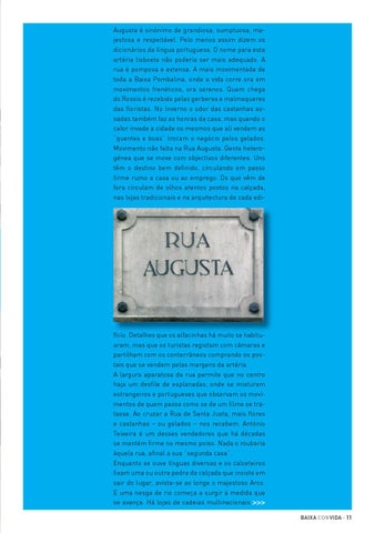 fício. Detalhes que os alfacinhas há muito se habituaram, mas que os turistas registam com câmaras e partilham com os conterrâneos comprando os postais que se vendem pelas margens da artéria. A largura aparatosa da rua permite que no centro haja um desfile de esplanadas, onde se misturam estrangeiros e portugueses que observam os movimentos de quem passa como se de um filme se tratasse. Ao cruzar a Rua de Santa Justa, mais flores e castanhas – ou gelados – nos recebem. António Teixeira é um desses vendedores que há décadas se mantém firme no mesmo poiso. Nada o roubaria àquela rua, afinal a sua “segunda casa”. Enquanto se ouve línguas diversas e os calceteiros fixam uma ou outra pedra da calçada que insiste em sair do lugar, avista-se ao longe o majestoso Arco. E uma nesga de rio começa a surgir à medida que se avança. Há lojas de cadeias multinacionais >>> BAIX A CON VIDA · 11
